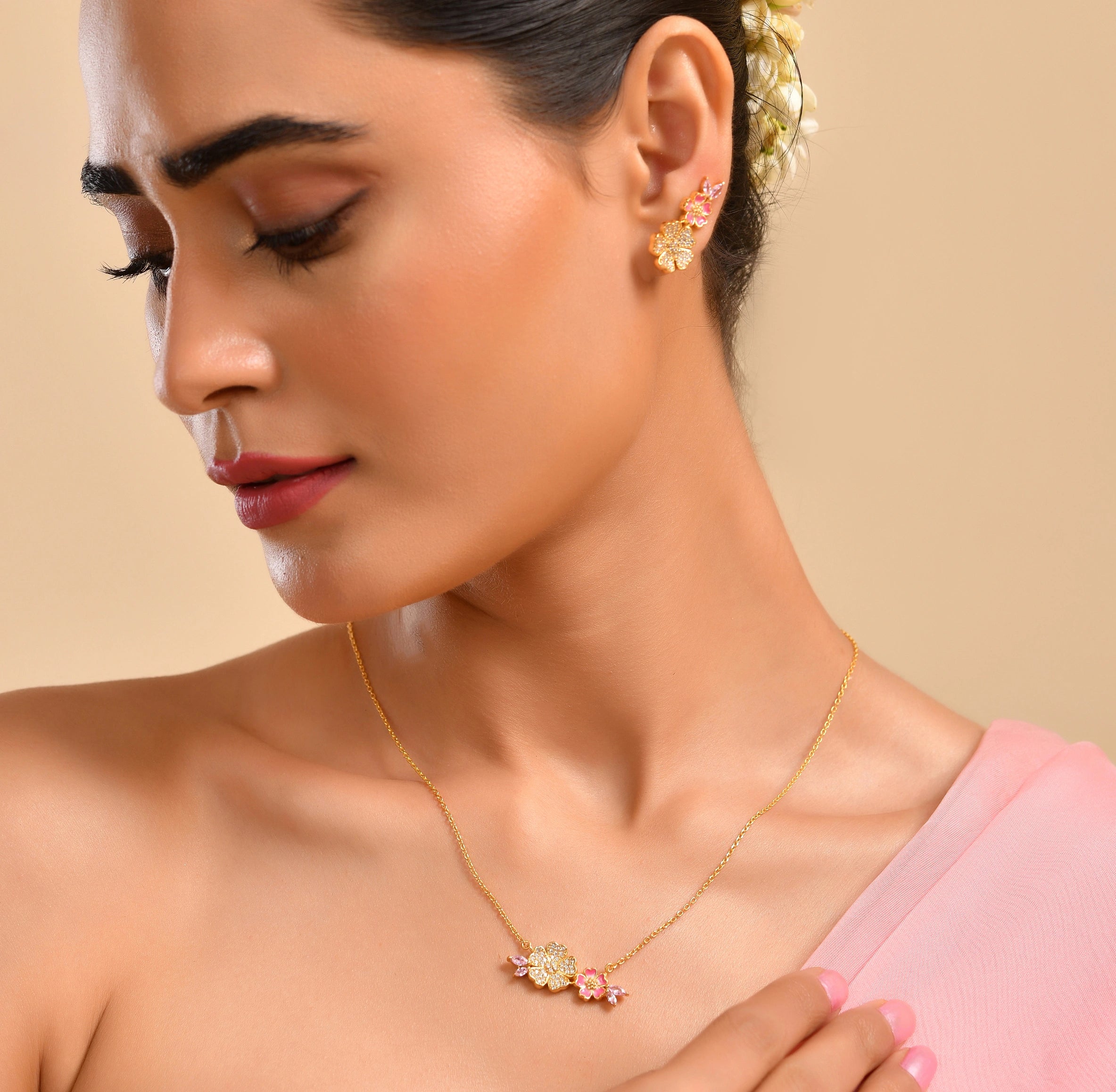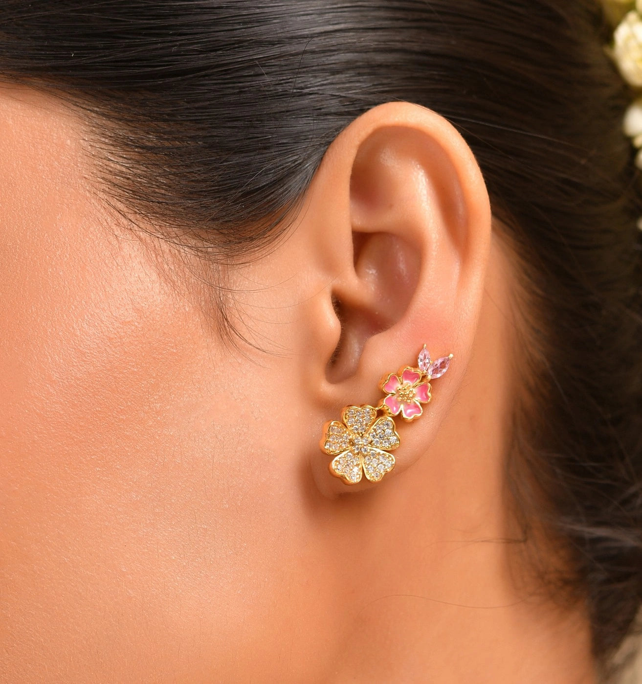 Say hello to your new favorite ear candy! These Bloom Babe Flora earrings are bursting with cherry blossom charm and playful personality. Crafted with shimmering pink AD stones and soft pink enamel details. Whether you're a flower enthusiast or just love statement pieces that make you smile, these beauties deliver instant glam with a whimsical twist. Dress them up or keep them casual—either way, you're guaranteed to turn heads and spread some floral joy!