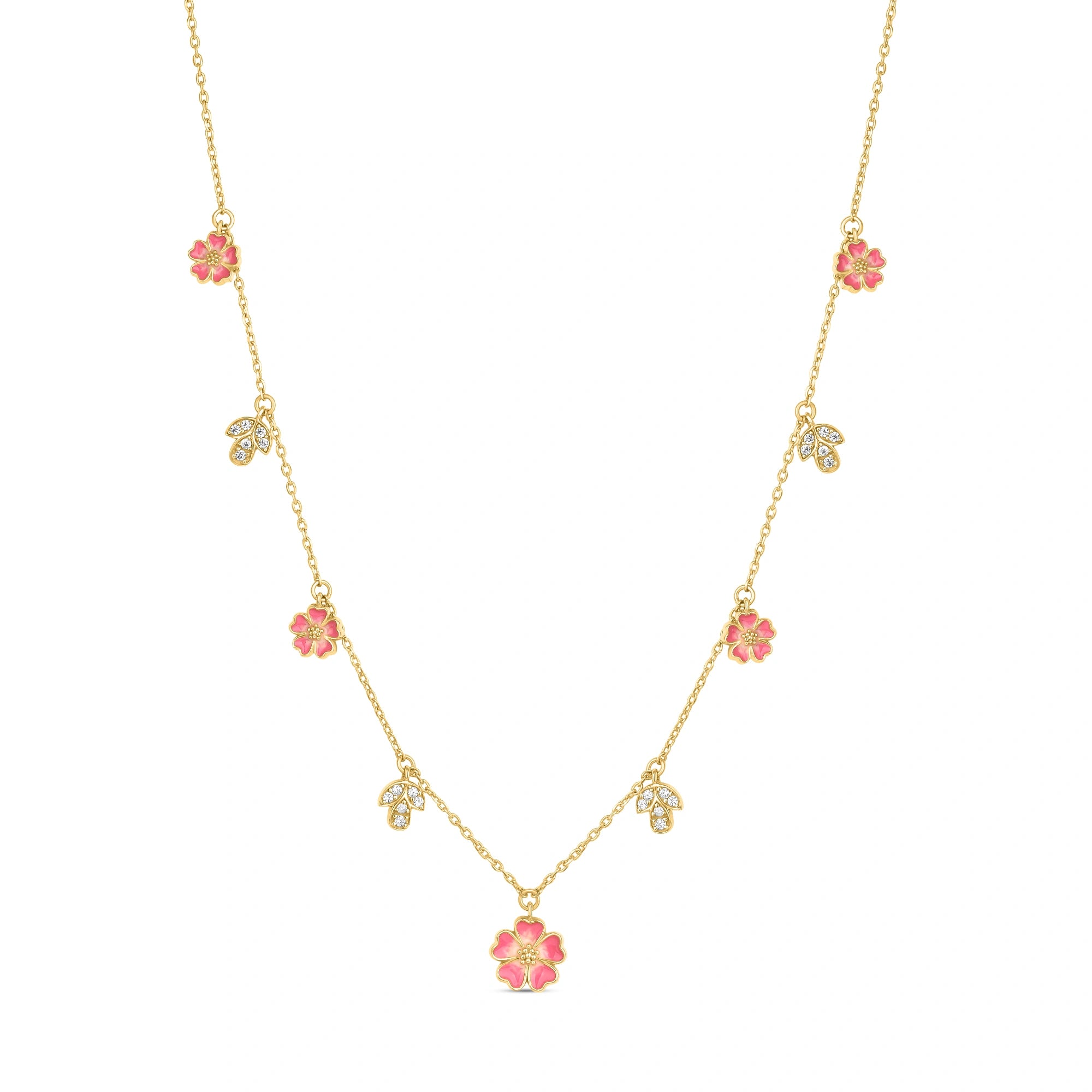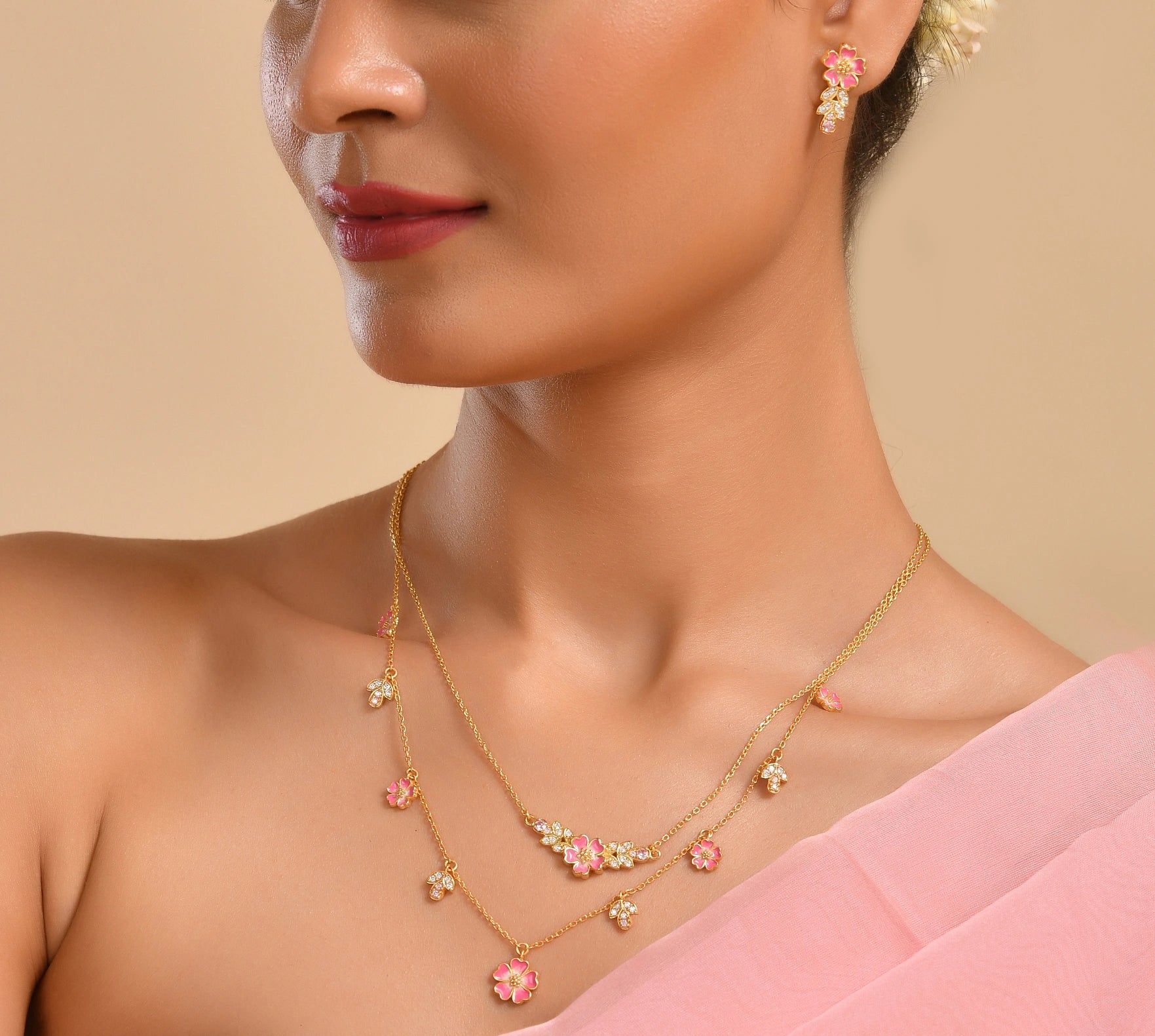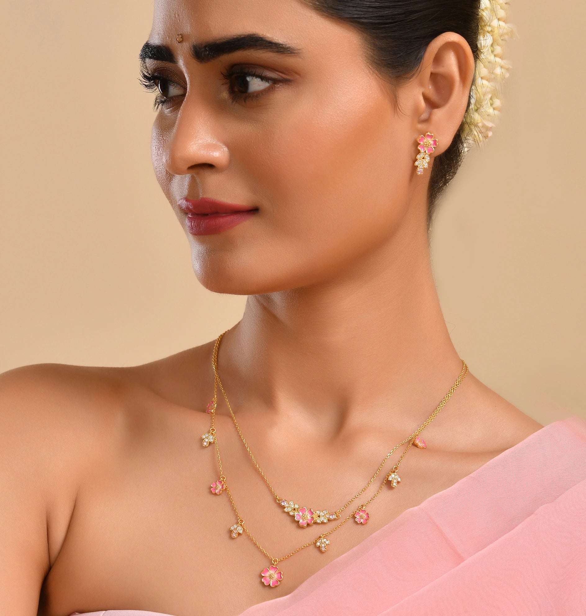 This charming piece combines 925 sterling silver with stunning pink AD stones and delicate pink enamel detailing that whispers of cherry blossom season. It's the kind of necklace that makes people stop and ask where you got it—and you'll love telling them about its nature-inspired design. Lightweight, versatile, and absolutely Instagram-worthy, it's perfect for adding a dash of botanical charm to your everyday adventures or special occasions.