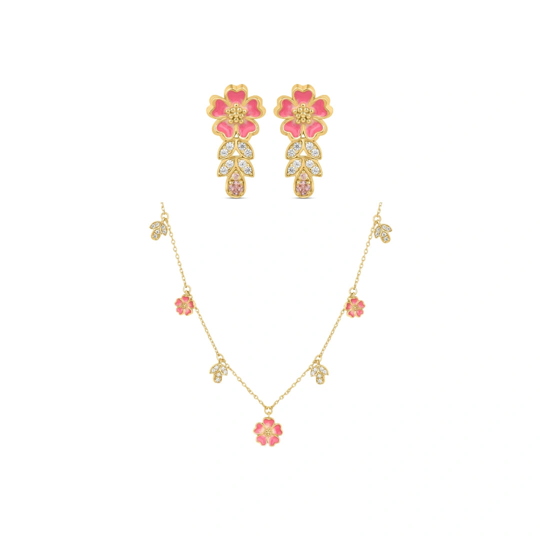 Made with 925 silver and 22kt gold plating, this necklace & earring set is designed to wear with your ethnic kurtis or off-white dresses or shirts or go match up with your pink outifts, providing a lightweight and comfortable option, ideal for the summer season. Brighten up your style with these playful and versatile earrings.