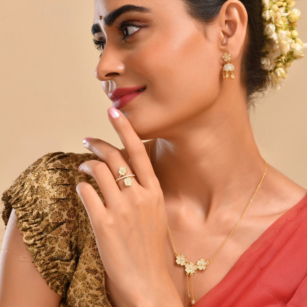 This dazzling piece studded with diamonds & inspired by flowers create a unique & classy festive look. Perfect for turning everyday moments into special occasions with a playful sparkle!