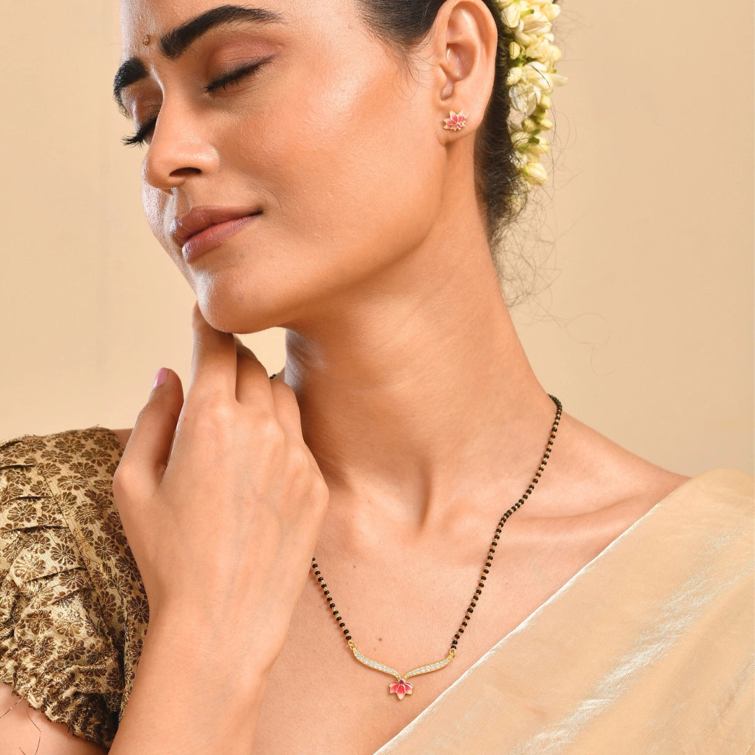 Celebrate tradition with a playful twist wearing the Padma Lotus Mangalsutra. Crafted from 925 silver with radiant 22kt gold plating, its exquisite enamel work honors Maa Lakshmi’s favorite lotus flower. Slip it on and bring the divine blessings and sparkling joy of Lakshmi into your home with every festive occasion!