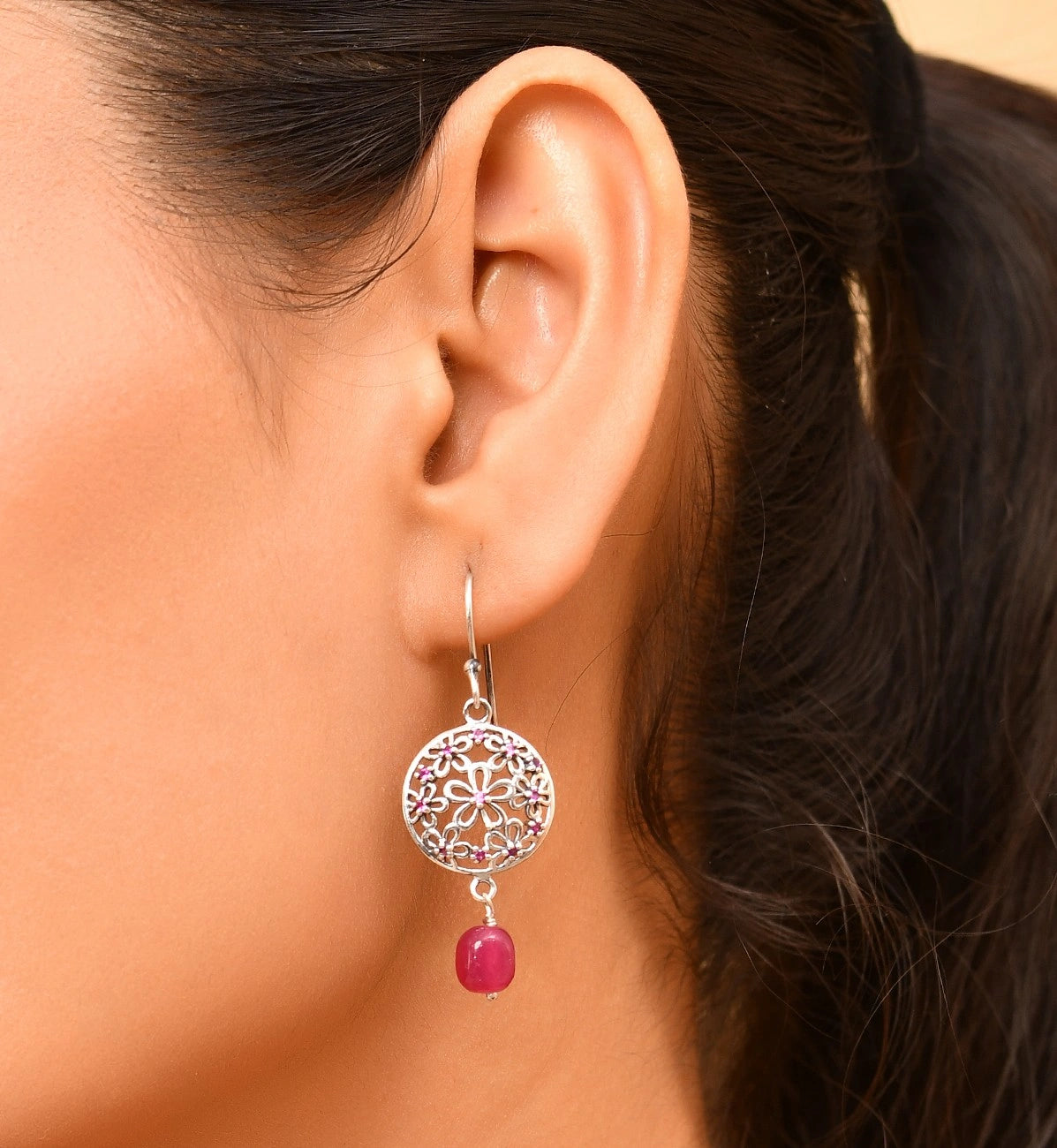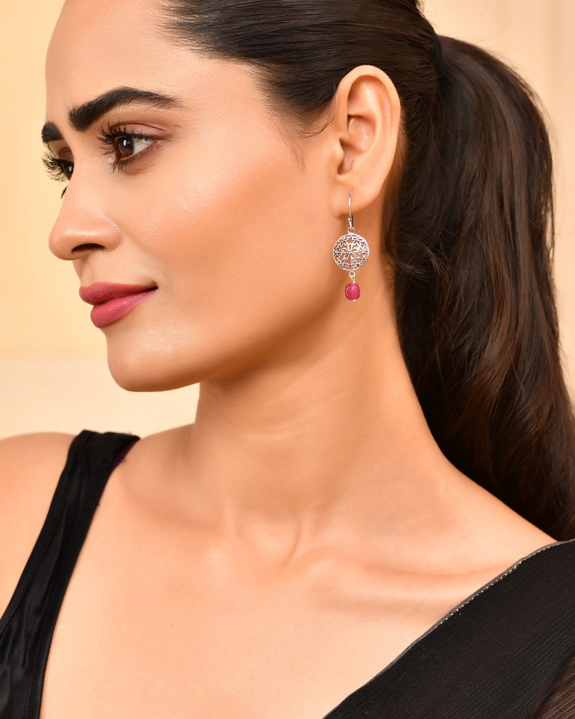 Crafted from oxidized 925 silver, they feature delicate pink stones that catch the light beautifully. The playful dangle design adds movement and grace to any traditional or indo-western outfit & simply brightening up your daily wear. Lightweight and versatile, these earrings blend timeless elegance with a modern twist—because great style shouldn't be complicated! Pair up with a kurti or a co-ord set.