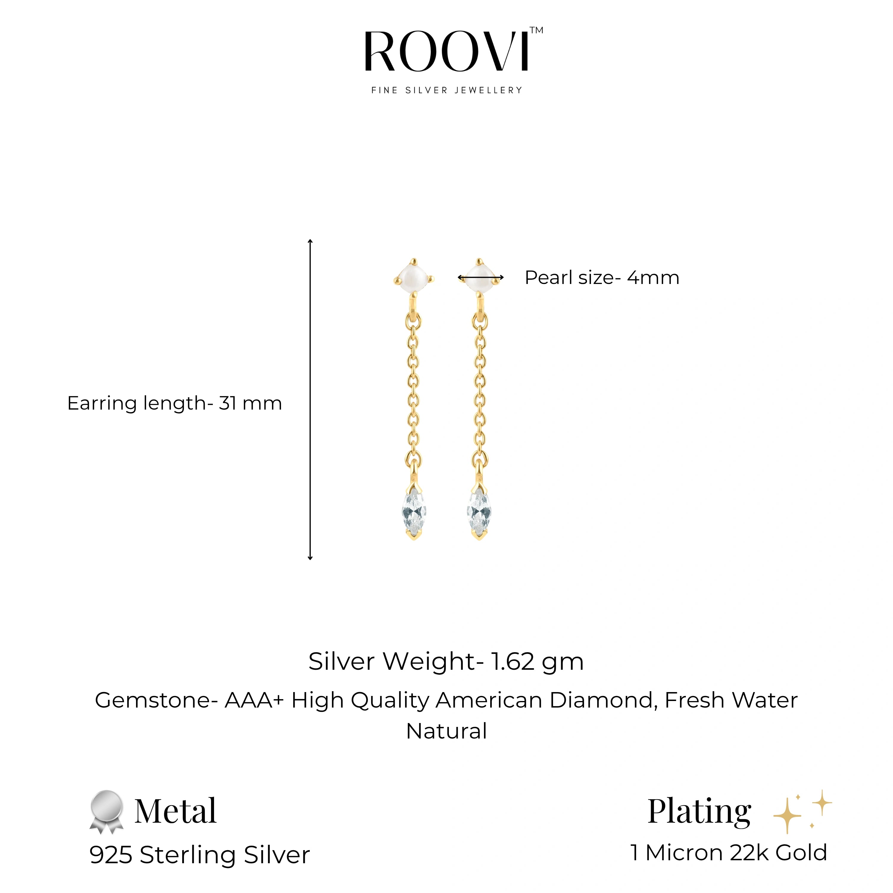 Additional Information - Silver weight- 2.1 gm, Dimensions: Earring length- 31 mm, Pearl size- 4mm, Material- Pure 925 Sterling Silver. Plating- 22kt gold plating. Gemstone- AAA+ High Quality American Diamond, Fresh Water Natural Pearl. Unit- 1 Pair. Handmade In Jaipur